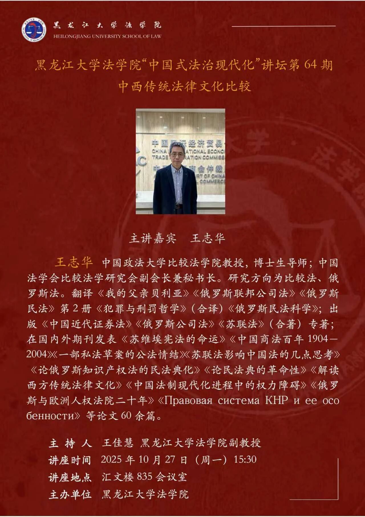 讲座预告 | 黑龙江大学法学院“中国式法治现代化”讲坛第64期 中西传统法律文化比较