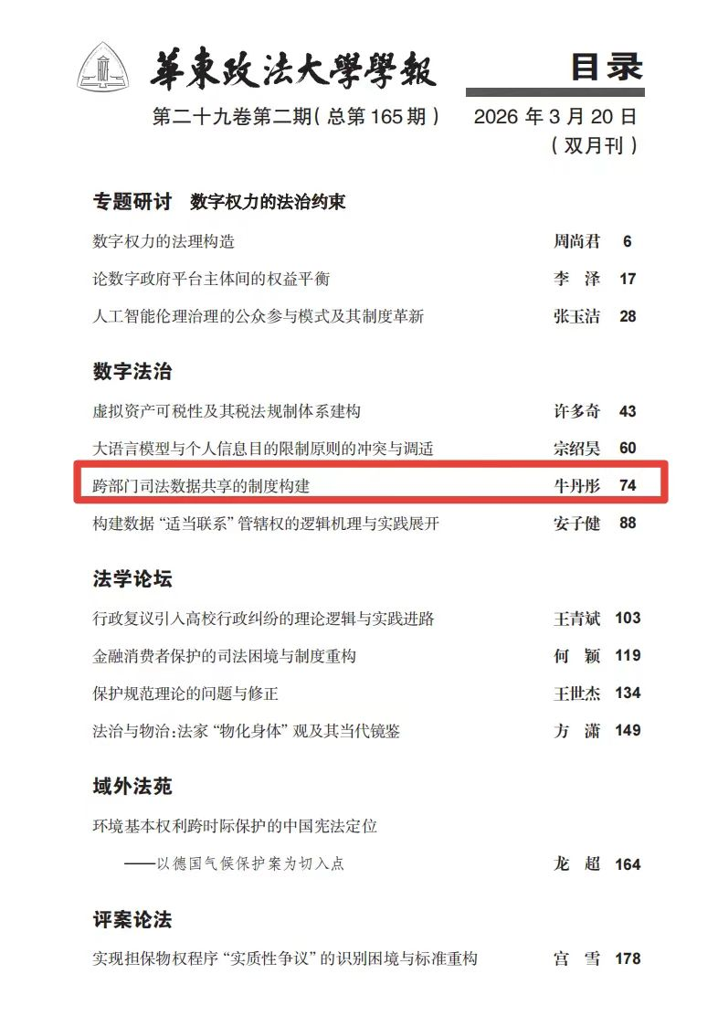 我院教师牛丹彤撰写的论文《跨部门司法数据共享的制度构建》被《华东政法大学学报》(2026年第二期)收录。
