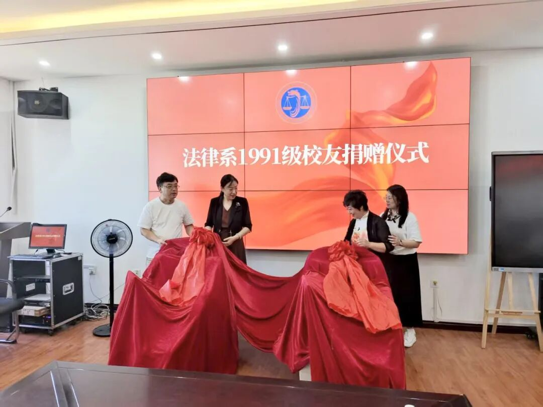 在热烈的掌声中,原法律系91级学生代表郝秀凤、孙明飞与法学院党委书记孙世萍、院长哈书菊共同揭开捐赠物品帷幔。本次捐赠的两台按摩椅可以让老师舒缓筋骨,以良好的身心状态更好地投身教学科研之中,不仅表达了对法学院各位老师深耕法学教育教学事业、诲人不倦无私奉献的不尽感激,更象征着岁月的沉淀与情感的凝聚,揭开了校友与母校之间深厚情谊与紧密联系的新篇章。