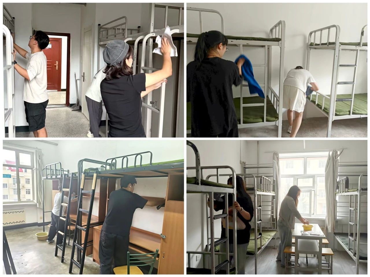 活动当日,志愿者们按照预先安排好的分组,有条不紊地拿着清洁工具前往各自负责的寝室。大家迅速进入各自岗位,分组合作、井然有序地展开清扫工作。从擦拭桌椅门窗、清理阳台积尘,到扫地拖地、整理床架,同学们不放过任何一个卫生死角,细致认真地完成每一项任务,汗水悄然浸湿衣衫,笑容却始终洋溢在脸上。经过两个多小时的彻底清扫,一间间寝室逐渐变得窗明几净、床桌整洁,阳光洒进焕然一新的房间,仿佛也提前点亮了即将启程的新生活。