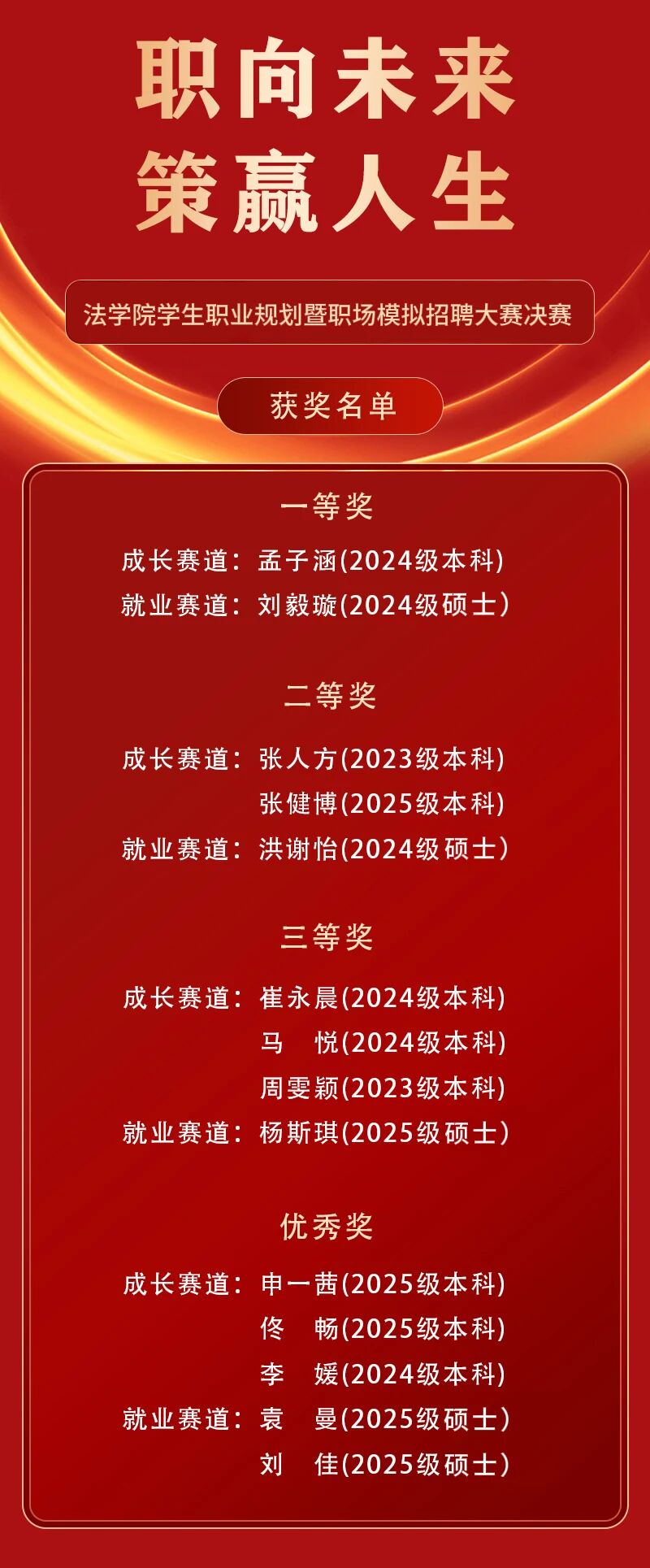 依据比赛规则,最终评选出成长赛道(本科生)一等奖1名,二等奖2名,三等奖3名,优秀奖3名;就业赛道(研究生)一等奖1名,二等奖1名,三等奖1名,优秀奖2名。本次大赛点燃大学生职业生涯规划热情,唤醒学生职业发展内生动力,切实提升就业创业核心素养,推动同学们深耕未来职业发展路径。此次赛事为学院就业指导工作锚定清晰方向,后续学院将不断深化职业生涯规划教育,以系统化指导与常态化培育,为学生实现高质量充分就业夯实稳固基础。