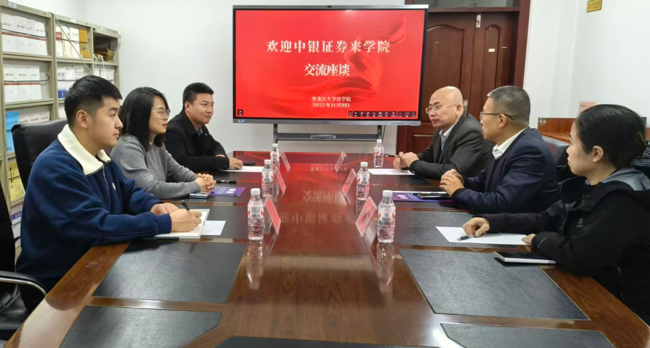 11月20日,中银证券黑龙江分公司一行应邀来我院进行访企拓岗交流座谈。中银证券黑龙江分公司综合办主任王旭、合规专员马永、互联网金融部负责人魏楠葳,法学院党委副书记董捷及研究生辅导员文浩然、王博参加座谈。
