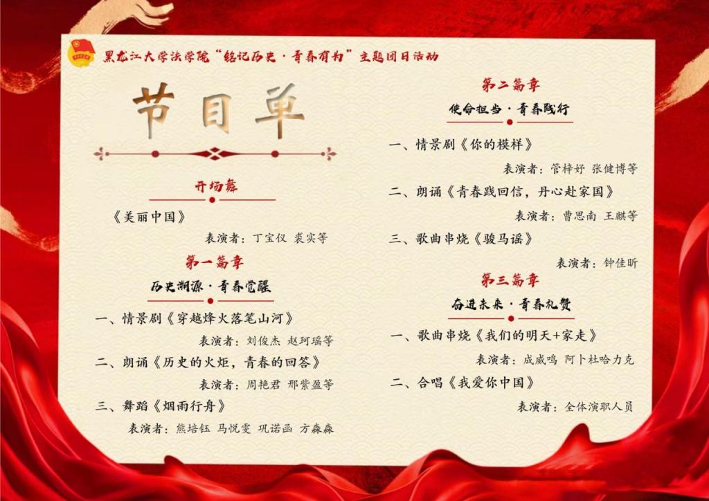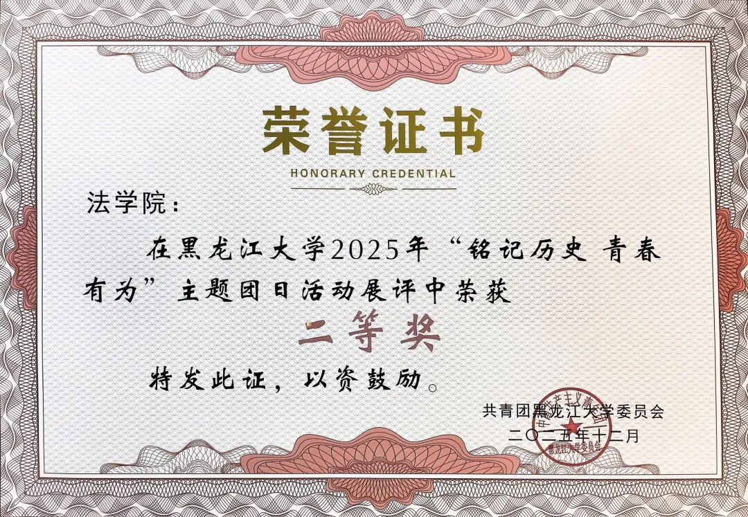 为纪念中国人民抗日战争暨世界反法西斯战争胜利80周年,深入贯彻党的二十大和二十届三中、四中全会精神,引导团员青年牢记历史使命、传承红色基因,展现新时代青年将个人成长融入国家发展的责任与担当,校团委组织开展了“铭记历史 青春有为”黑龙江大学2025年主题团日活动展评活动,法学院高度重视、积极组织,在展评中荣获二等奖。