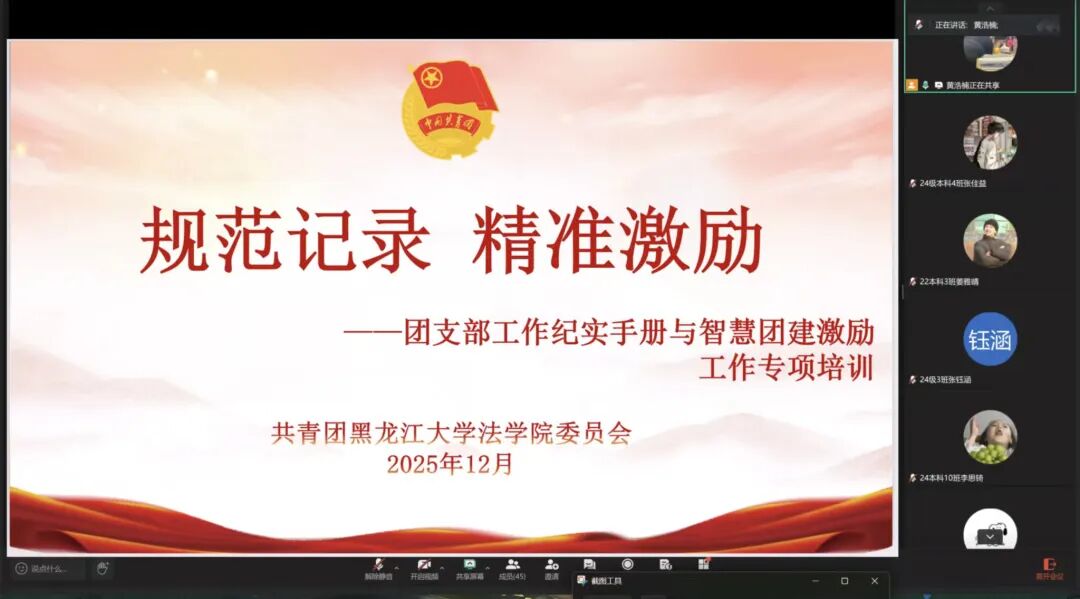 为进一步加强基层团组织建设,提升团支部工作记录与智慧团建系统操作的规范化、标准化水平,12月21日,法学院团委线上召开专项培训,本次培训会由学院团委学生副书记黄浩楠主持,各年级团支部书记参加。