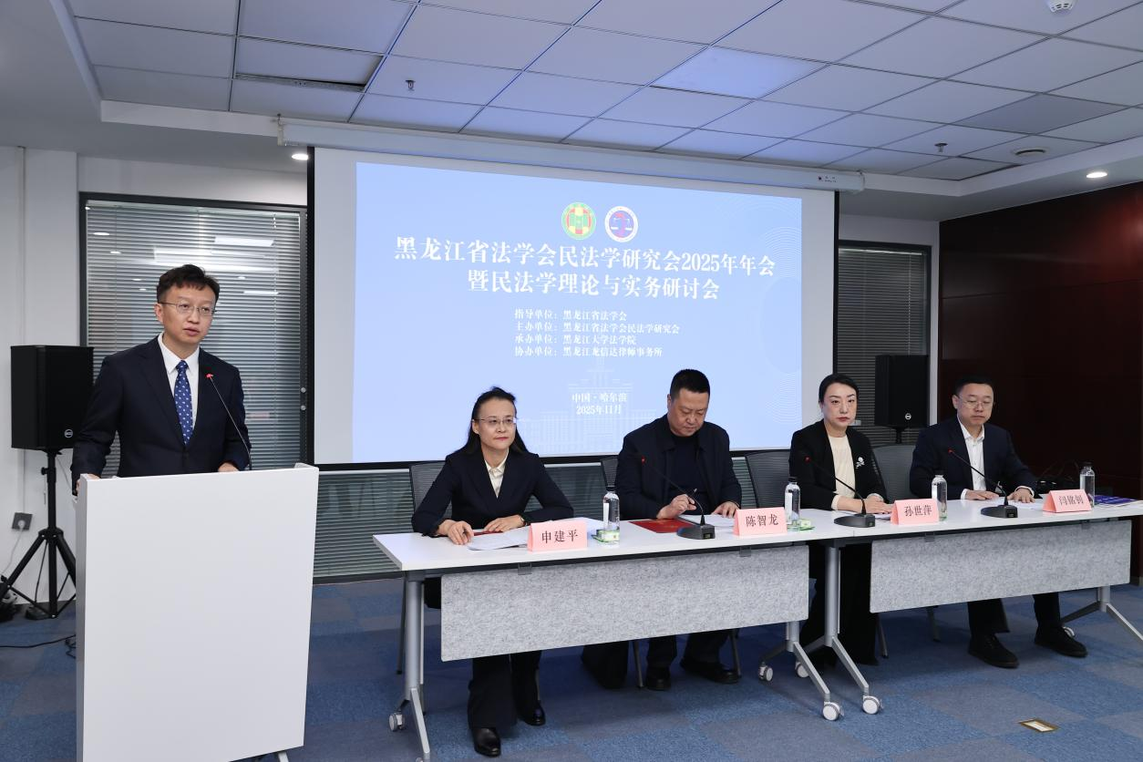为促进黑龙江省民法学理论研究与实务工作的繁荣发展,加强学界与实务界的交流与合作,11月22日,黑龙江省法学会民法学研究会2025年年会暨民法学理论与实务研讨会在黑龙江龙信达律师事务所召开。本次会议由省法学会指导,省法学会民法学研究会主办,黑龙江大学法学院承办,黑龙江龙信达律师事务所协办。省法学会办公室主任陈智龙、黑龙江大学法学院党委书记孙世萍、省法学会民法学研究会会长申建平、黑龙江龙信达律师事务所副主任闫铭钊出席会议并致辞。民法学研究会101名理事通过现场和线上的方式参加会议,会议由省法学会民法学研究会副会长兼秘书长、哈尔滨医科大学教授霍原主持。