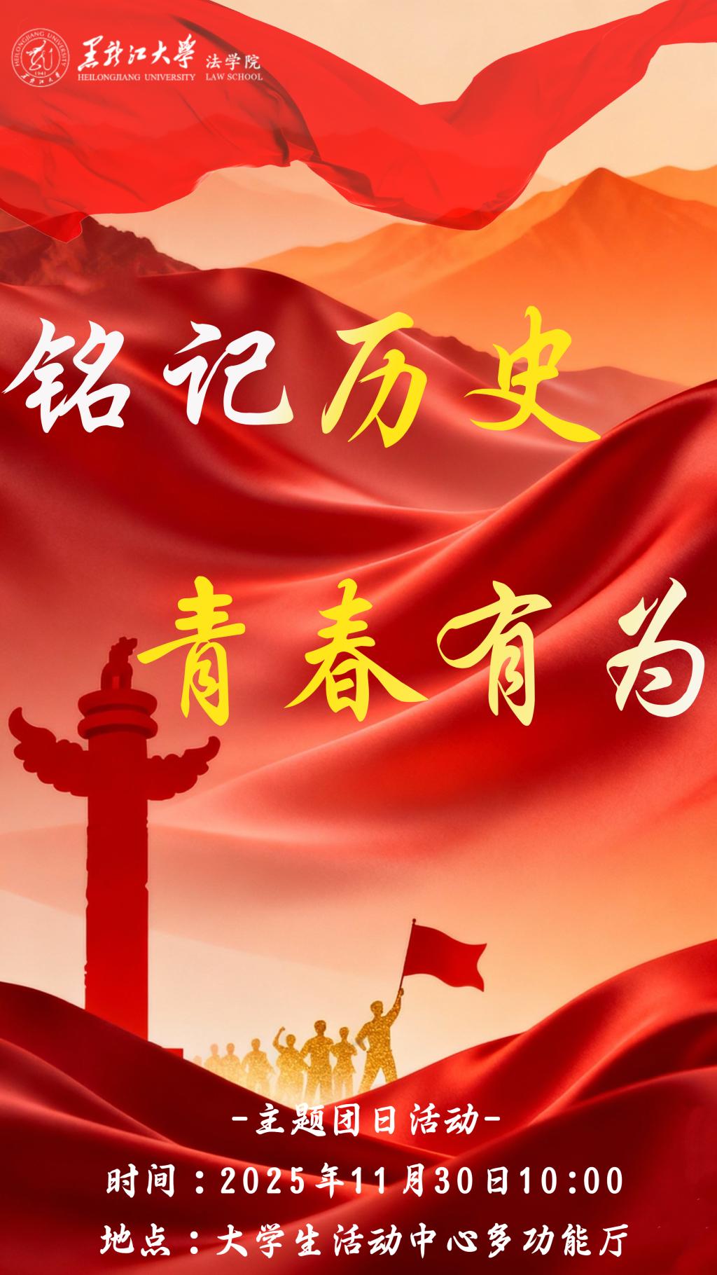 为热烈庆祝中国人民抗日战争暨世界反法西斯战争胜利80周年,深入贯彻党的二十大和二十届三中、四中全会精神,引导团员青年牢记历史使命、传承红色基因,展现新时代青年将个人成长融入国家发展的责任与担当,我院团委将举办“铭记历史 青春有为”主题团日活动。现诚挚邀请您与我们共赴青春之约,共话使命担当!