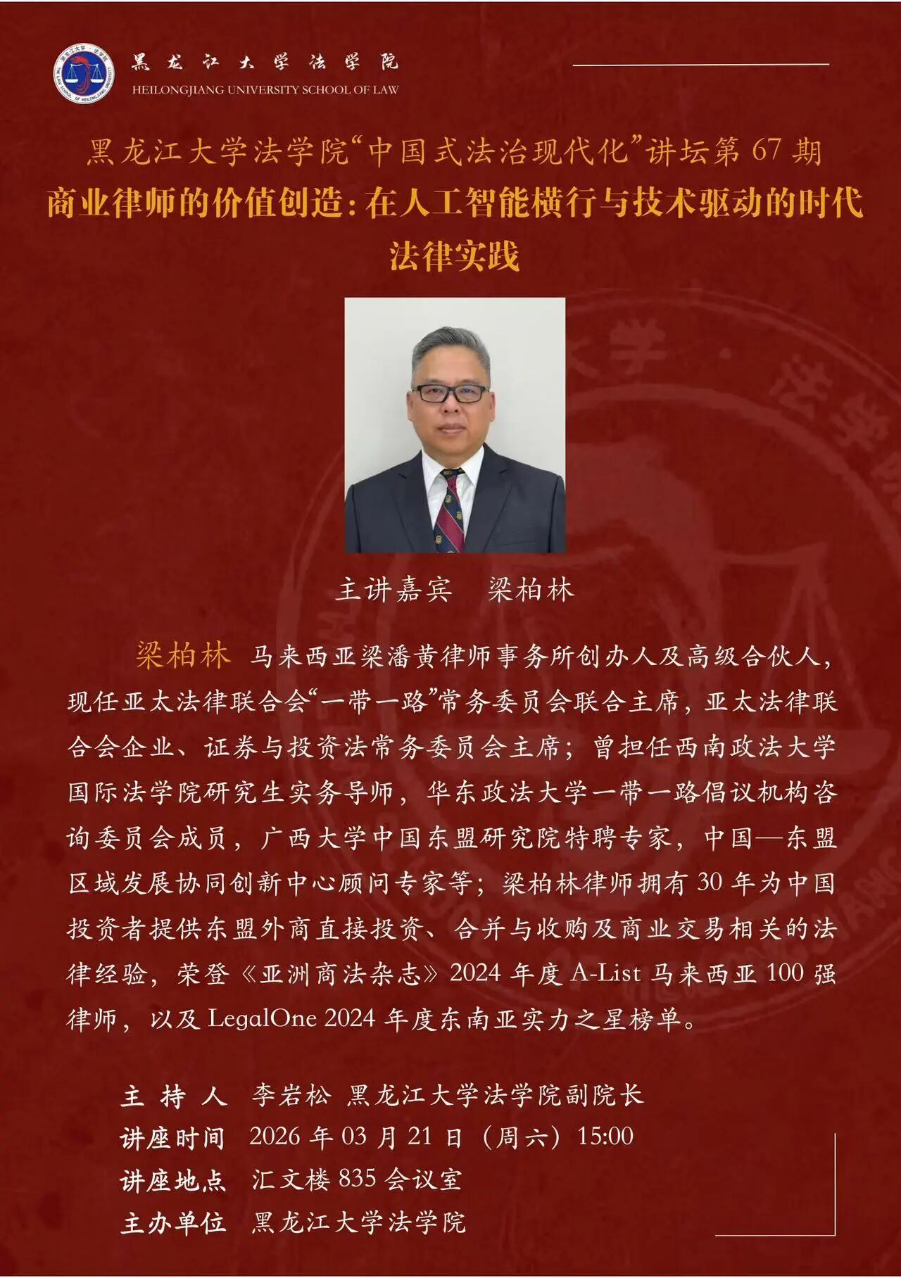 讲座预告丨黑龙江大学法学院“中国式法治现代化”讲坛第67期 商业律师的价值创造:在人工智能横行与技术驱动的时代法律实践