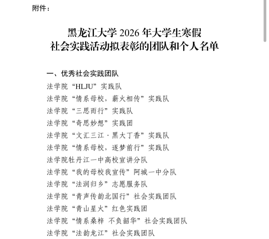躬身实践显担当,笃行实干绽芳华。学子们自主组队、踊跃参与,充分展现了良好的协作意识与实践能力,实践团队深入基层,体察民情,服务群众,以青春担当为社会主义现代化建设贡献力量。其中,法学院“HLJU”实践队、“情系母校,薪火相传”实践队、“三思而行”实践队、“奇思妙想”实践团、“文汇三江·黑大丁香”实践队、“情系母校,逐梦前行”实践队、牡丹江一中高校宣讲分队、“我的母校我宣传”阿城一中分队、“法润归乡”志愿服务队、“青声传韵北国行”社会实践团队、“青山星火”红色实践团、“情系桑梓 不负韶华”社会实践团队、“法韵龙江”社会实践团队共13个团队表现优异,荣获“黑龙江大学2026年寒假社会实践活动优秀实践团队”荣誉称号。